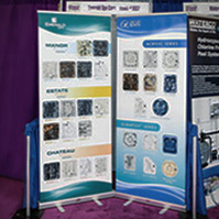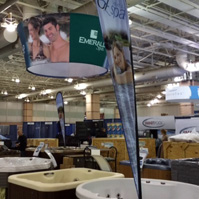 Our team created a 10' tapered, circular ceiling banner to help showgoers spot Emerald Spas’ booth from a distance, as well as 11.5' teardrop flags to help catch the attention of attendees walking nearby. Additionally, we created pop-up banners and spec sheets to give more detailed product information to those walking through the booth.